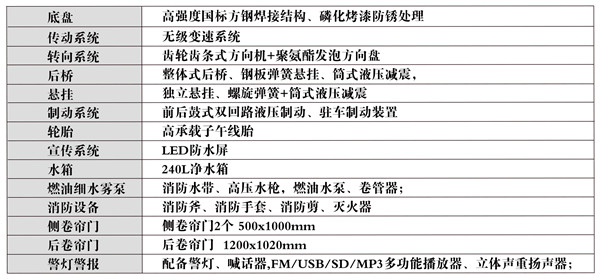 采用優越的汽車底盤技術、獨立懸掛系統、金屬結構,一次性鋼模沖壓結構,整體車身、及車架采用陰極電泳處理。更注重實用性,集警燈、喊話器等警務系統及工具箱于一體,消防器材齊全,能夠及時做出反應。