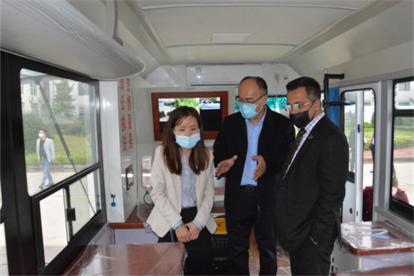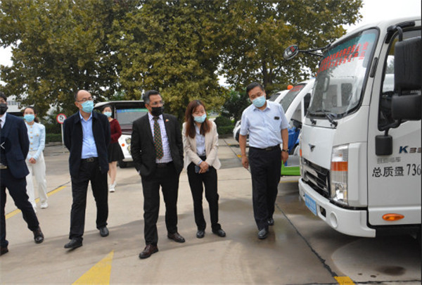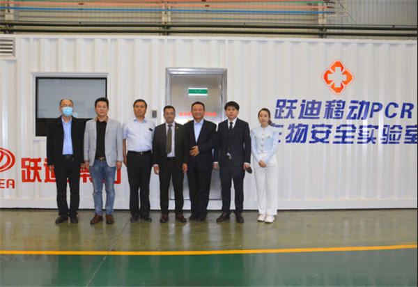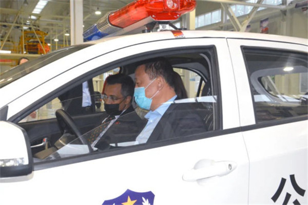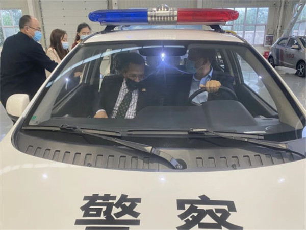 劉明海總裁向納祖明公使一行介紹了河北躍迪新能源集團五大生產基地,隨后參觀了四大工藝生產車間,詳細了解了機器人焊接生產線的情況,參觀過程中納祖明公使登上核酸檢測方艙了解方艙功能并試駕了躍迪新能源汽車。